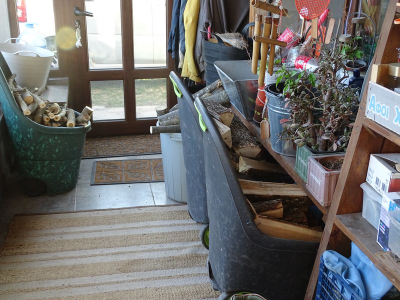 Emula came round and sorted the wood for me about twelve but forgot to bring one of the basket in the house and I forgot to ask him. I didn't need to light the fire until four this afternoon as the temperature was beginning to fall. My first visitor was the lady from my next door garden and she came with gifts, yogurt that she'd made, potatoes that she'd grown, eggs from her chickens and her company. She'd not been inside the house before and commented on my kitchen units and how well the kitchen was designed. She loved the large windows and how warm the house was and I'd only just lit the fire. Next visitor brought the chicken I'd asked for, more soup and hamburgers in a mushroom sauce that I had for supper tonight. Now I'm the wrong side of the curtain that stops the heat racing up the stairs so I'm not going to linger long...i need to get back to the fire. LN......It's going to be a really cold one, I cn tell......LN
