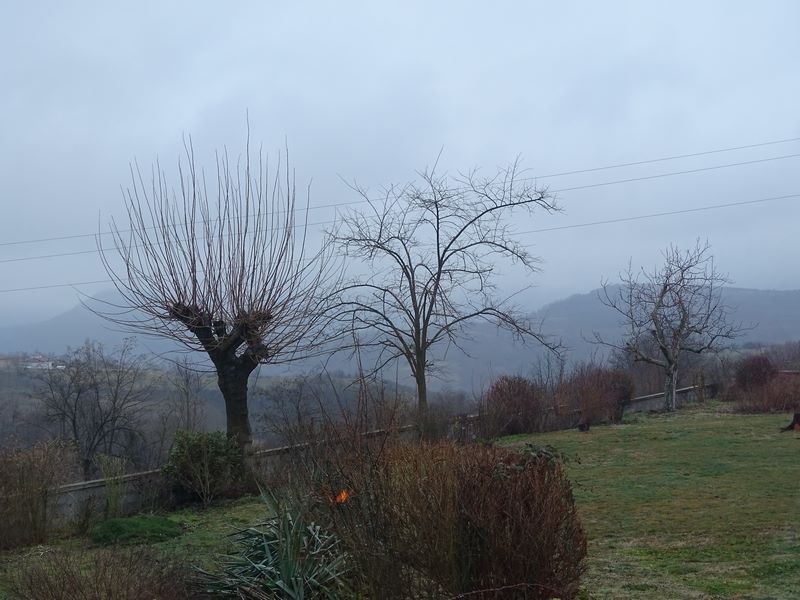 We had the same ghostly morning but this time it was very damp also. The terrace have more or less dried up but the mist seems to have lingered all day and the hillsides are still a little murky. Damp, miserable and cold and the fire seems to have been influenced by it as well. It seems to have needed more attention than normal. I had a very restless night, a toilet break at one thirty and I was reading until three and again i just seemed to have settled off and I needed the toilet again....it must be something in the water since that's all I'm drinking and I was up and about at six. I made coffee and negotiating the staging posts on the way back to the bedroom where I could place a cup, take a few more paces with my frame and move the cup to the next resting spot and back to bed. I tried to get comfortable, read for a while but it just wasn't happening so I made it to the sofa stopping along the way to get the fire underway.