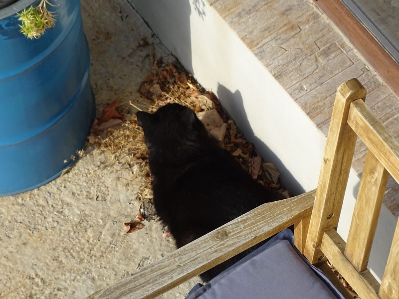 I made my usual starter drink, took it back up to the bedroom and sat in the rocking chair watching the morning come to life. It looked like it was going to be a good day but I've been caught out before but in this case it delivered what it had promised. I made my last tomato on toast for breakfast, no sign of the cat this morning but this afternoon as I was making my way from the little house to the terrace it slouched across the yard and later I spotted it against the inside front wall of of the house looking quite sad and forlorn. It seemed to have come from the garage where there is a box in a sheltered position so perhaps I'd disturbed it rattling around in the woodstore.