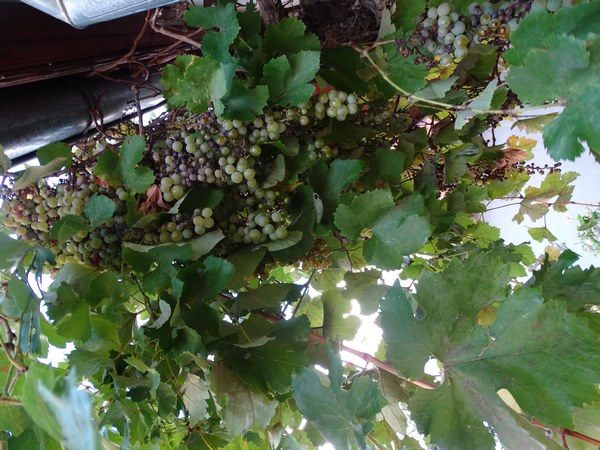 I made poached eggs and ham on toast for breakfast, topped up with coffee and I think it's the cold weather that's edging me towards food. I didn't rescue the fire, the house wasn't cold and I opened up the curtains to let what warm air there was in the lounge circulate. I pottered this morning, putting washing away, putting clothes away and generally not doing much. I made up for it this afternoon though, I decided to cut back the grapevine on it's first every flowering since I've been here and thought I'd bitten off more than I could chew. There were lots of lazy bees feeding that became a little frenzied as I attacked the vine but I kept at it, moving the branches to the other side of my gate and the cows would have them on their way home. I moved to the woodstore and found the shears intending to remove some of the shrubs that had started to take over the grass but they weren't sharp enough so I ended up using my electric trimmer which worked if I held on to the branch and was determined.....after all, it is a hedge trimmer not and edge trimmer. That debris went over the hedge for the cows that weren't taking the highway home and I carried on and found other jobs to do. The oak tub with the metal bands is now put away for the winter, I tried to move the wooden box that sits on casters but the wood is wet and it's too heavy....don't want to do any damage to my back and will wait for another day. Next job was to turn over a couple of the big containers that haven't got holes drilled in them to drain the water. The looked like they were drowning and I should have finished off by moving them to the little house but it's still a little early but I did take the flower head from the sun-daisies in the same pot as the freesias...I'd forgotten that they were in the green pot that I'd used last year when I had them in the house. I'll move them to the porch to dry out a little and then into the house when they're about to flower....bugs permitting.