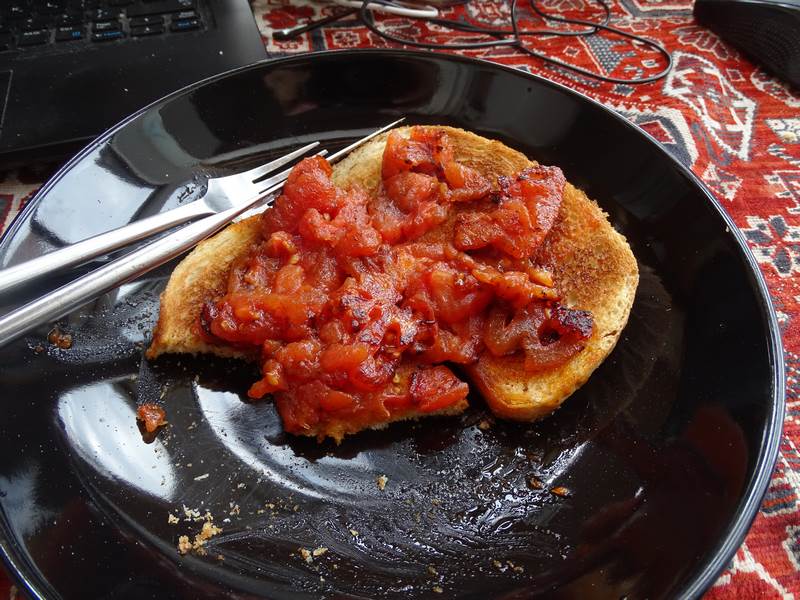 Not a bad day today at all. There was a hint of what was in store, it picked up mid-morning and we had a very good afternoon. There was still a chill in the air but I didn't light the fire until six this evening. Cat was around but obviously got hungry before I got my act together so ended up roaming the village and now seen her since. I was cooking my tomatoes on toast at around nine thirty after supping my honey, salt and sugar mixture to set myself up for the day. I've also put some cloves in to soak, the locals make this drink with some red fruit and clove water and I must really find the recipe. We had it at the mevlit I went to at the weekend and it reminded me that I wanted to do it.