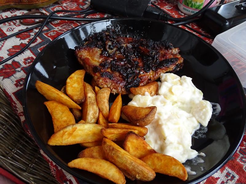 I found some pork chops in the freezer and unfortunately four had turned into one big one so I partially thawed them in the microwave enough to prise two of them away from the others and put them to thaw. The other two went back into the freezer and will come out at a later date I'm sure. I had a tidy round, I had a good day yesterday and remembered that it was Sunday after all, a day of rest but unfortunately I ended up watching Netflix for most of the afternoon. It was a Turkish drama which was doing OK until the last episode which didn't end, in my book, as it should have done. I started supper around five thirty, the chops had fully thawed out so I set about pan frying one of them, the second one is in the fridge for tomorrow, I made a sauce with tomato sauce, barbecue sauce, onions and a little vinegar and the chop is ready, the heat is turned off and it's waiting to be served with the sauce, potato wedges and a little potato salad, Lidl special.