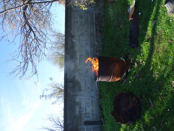 I noticed the rubbish bin in the conservatory so picked up the fire lighter, the basket of rubbish and headed down to the bottom of the garden and the burning container. I'd put the lid back on it from the last time and fortunately despite the incessant rain over the last couple of weeks, it didn't take long to light and was soon destroying the evidence....bean cans, potato peelings and onion skins. I let it burn without the lid on and watched it for a while, put the lid on and sat on the wall enjoying the view, the blue sky and the beauty of my surroundings. I left it to its own devices and tackled another job that I should have done probably in the spring. Some of the large buckets had accumulated lots of rain water almost brimming over the containers so I took a hammer and a nail, drove the nail through the containers at the bottom and the water started to come out. I'll made a better job of it for next year. I toyed with the idea of bringing in the plant pots but it still seems early, the temperature went down to eight degrees overnight and despite the sun it's not climbed much higher but I'd dressed for the weather so didn't get cold.